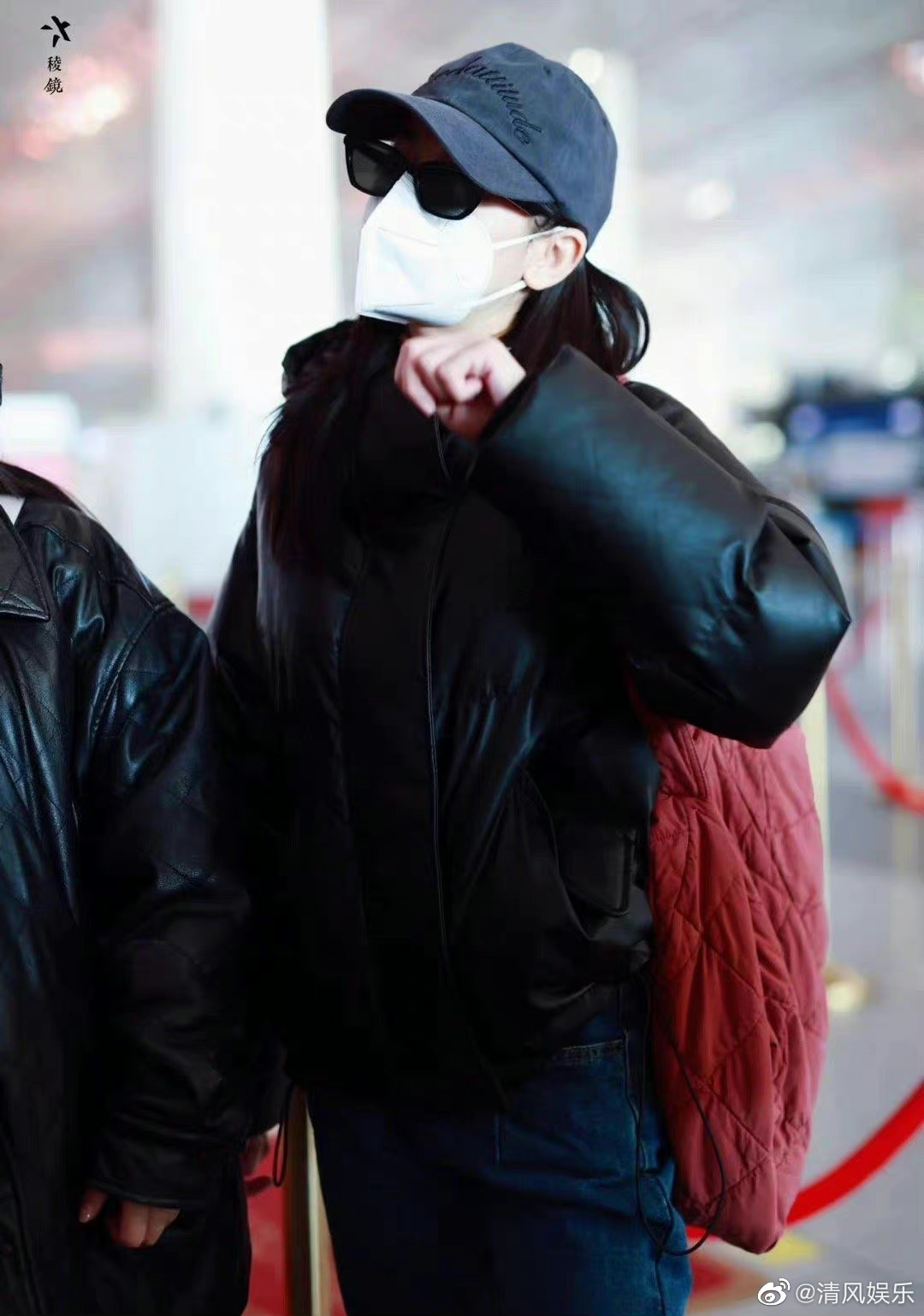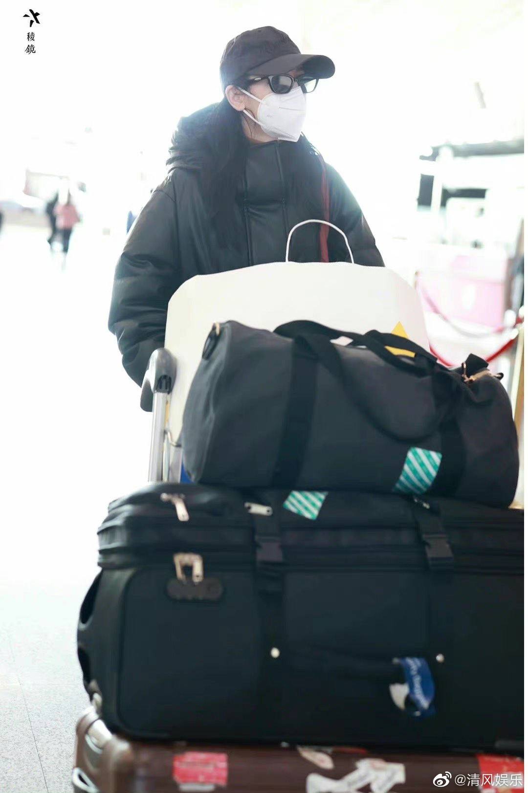迪丽热巴今日机场路透,黑色羽绒服+棒球帽造型,推了好多行李啊,是要进组了嘛