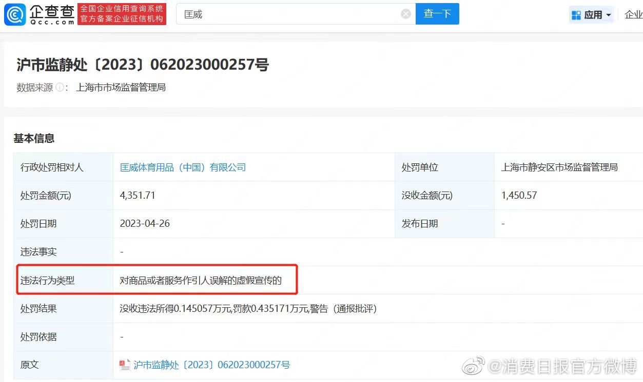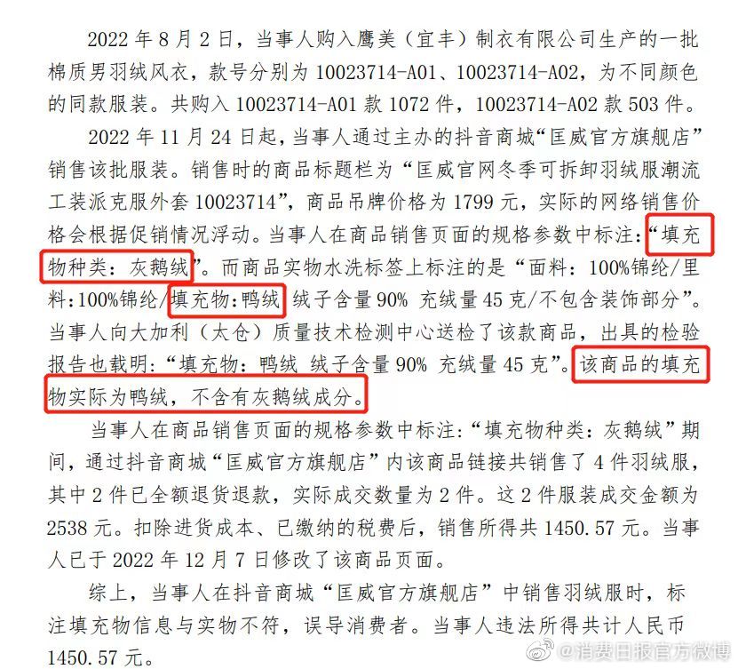 【#匡威旗舰店因虚假宣传被处罚#羽绒服填充物非鹅绒而是鸭绒】近日,小编从企查查获悉,匡威体育用品(中国)有限公司因虚假宣传被上海市静安区市场监督管理局警告(通报批评),罚款4351.71元并没收违法所得1450.57元。小编了解到,当事人在 “匡威官方旗舰店”内销售一款羽绒服时,商品页面上宣传商品的填充物种类为“灰鹅绒”,商品实际填充物为“鸭绒”,不含有“灰鹅绒”成分,标注填充物信息与实物不符,误导消费者。