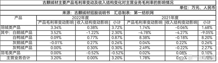 2021年主营业务产品毛利率较2020年增加1.78%,主要原因系2021年公司白鸭绒产品毛利率上涨幅度较大。2022年主营业务产品毛利率较2021年增加3.20%,主要原因系2022年公司白鹅绒产品毛利率增长。(第一纺织网 martin)