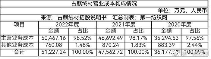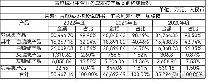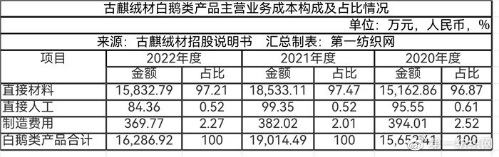 报告期内,古麒绒材羽绒类产品的成本分别为34,764.35万元、45,848.43万元和50,444.70万元,占主营业务成本的比例分别为98.50%、98.19%和99.96%,是公司主营业务成本的主要构成部分。