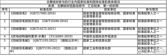古麒绒材的主营业务聚焦于高规格羽绒产品的研发、生产和销售,公司及相关人员参与了《羽绒羽毛》《羽绒羽毛检验方法》国家标准的制定,公司也是羽绒羽毛生产加工行业中唯一一家参与了《羽绒服装》新国家标准制定的企业。