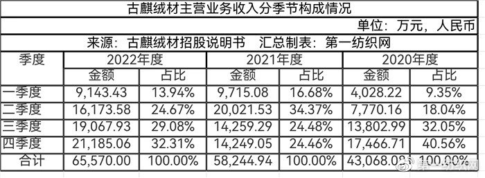 2020年,受疫情形势变化、新客户开发等因素影响,使古麒绒材上半年的收入占比较低、下半年收入占比较高。首先,2020年上半年新冠疫情爆发,客户订单量下降,同时疫情导致市场供需失衡,羽绒产品售价大幅下降。在订单量与产品价格下降的共同作用下,当年上半年收入较少、收入占比较低。当年下半年,疫情形势趋稳,订单量逐步回升,同时羽绒产品价格恢复性上涨,因此使下半年收入较多、收入占比较高。其次,2020年公司着力开发羽绒寝具客户,尤其是新开发了清龙羽绒(罗莱生活供应商)、兴瑞羽毛等重要客户,这些客户下半年开始批量采购,使下半年收入进一步增长。在上述因素的共同作用下,2020年下半年收入占比较高。