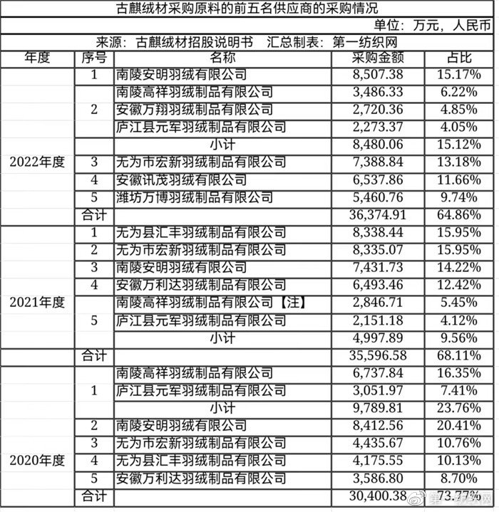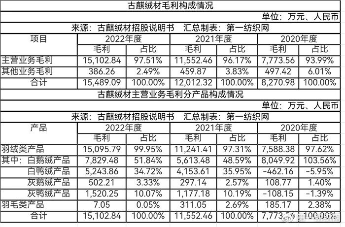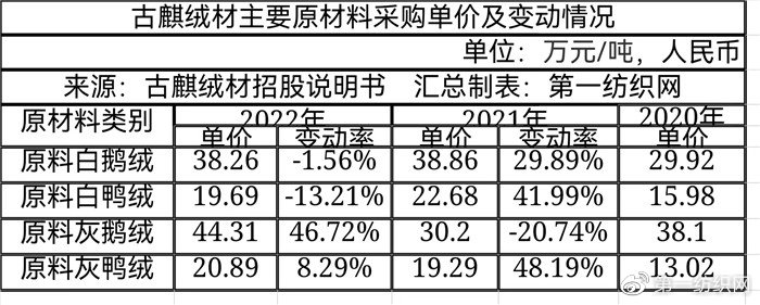 第一纺织网据招股说明书获悉,古麒绒材成立于2001年,是一家以羽绒材料为核心的羽绒制品企业,主要从事高规格羽绒产品的研发、生产和销售,公司主要产品为鹅绒和鸭绒,产品主要应用于服装、寝具等羽绒制品领域。