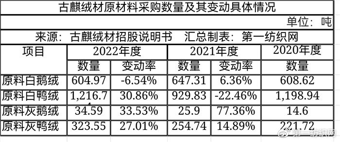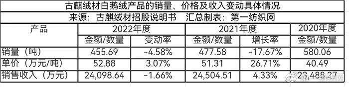 报告期内,古麒绒材的白鹅绒产品的销量分别为580.06吨、477.58吨和455.69吨。2021年度销量有所下降,主要系部分客户基于自身需求降低采购量所致,2022年度销量基本保持稳定。