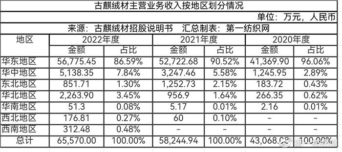 报告期内,古麒绒材的华东地区主营业务收入占比分别为96.06%、90.52%和86.59%,是公司主要收入来源地区。