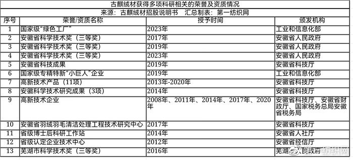 截至目前,古麒绒材已经与海澜之家、森马服饰及其旗下童装品牌巴拉巴拉、罗莱生活、际华集团、波司登、鸭鸭股份等客户建立了合作关系。公司被中国羽绒工业协会评为“中国羽绒行业优秀企业”和“中国羽绒行业优质供应商”,获得了“中国驰名商标”“首批安徽省制造业高端品牌培育企业”等荣誉。