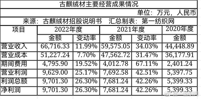 第一纺织网据招股说明书获悉,报告期内,古麒绒材的营业收入分别为44,448.89万元、59,575.05万元和66,716.33万元,年均复合增长率为22.51%。报告期内,公司净利润分别为5,399.33万元、7,681.24万元和9,701.30万元,年均复合增长率为34.04%,呈较快的增长趋势。公司利润的主要来源是羽绒产品的销售,公司报告期内不断开发新的客户,净利润保持增长态势。