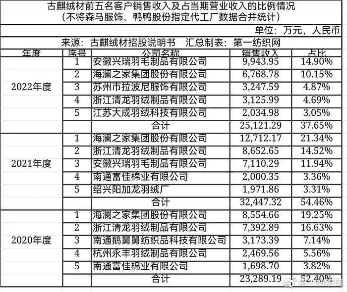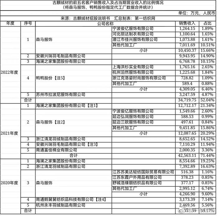 报告期内,将森马服饰、鸭鸭股份指定代工厂数据合并统计,古麒绒材的前五名客户销售收入及占当期营业收入的比例情况如下: