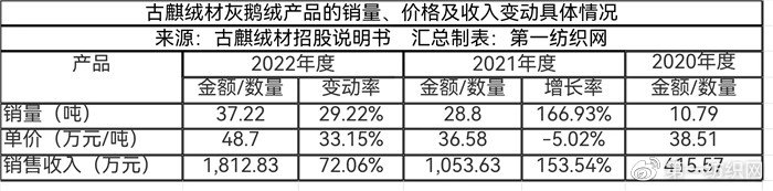 报告期各期,古麒绒材灰鸭绒产品的收入分别为2,550.82万元、6,483.24万元和8,376.08万元,占主营业务收入比例分别为5.92%、11.13%和12.77%,收入占比逐年提升。公司灰鸭绒产品的收入及销量整体呈上升趋势,2021年灰鸭绒产品销售收入增长较多主要原因系部分客户对灰鸭绒产品的需求增长,同时疫情形势趋稳后销售价格逐步回升。2022年灰鸭绒产品销售收入持续增长,主要原因系部分客户对灰鸭绒产品的需求增长以及公司开发了多家新客户。