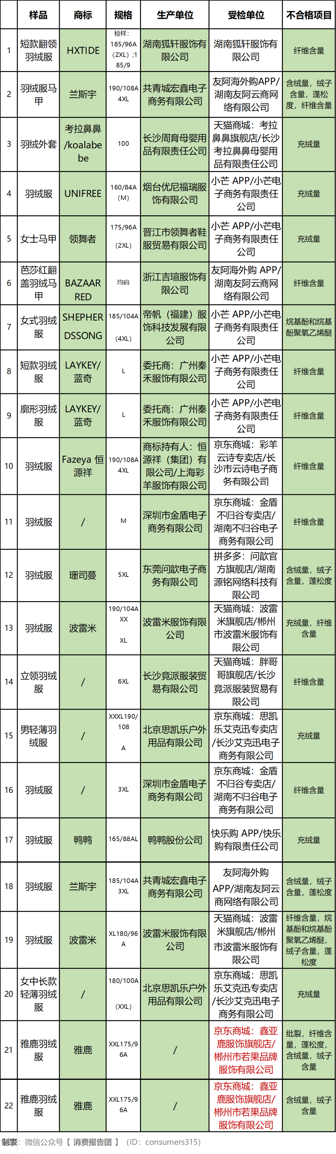 本期检出鸭鸭股份公司生产的“鸭鸭”羽绒服、长沙周育母婴用品有限责任公司生产的“考拉鼻鼻”羽绒外套等“充绒量”项目不合格,东莞问歆电子商务有限公司生产的“珊司蔓”羽绒服、波雷米服饰有限公司生产的“波雷米”羽绒服等检出“含绒量”项目不合格。