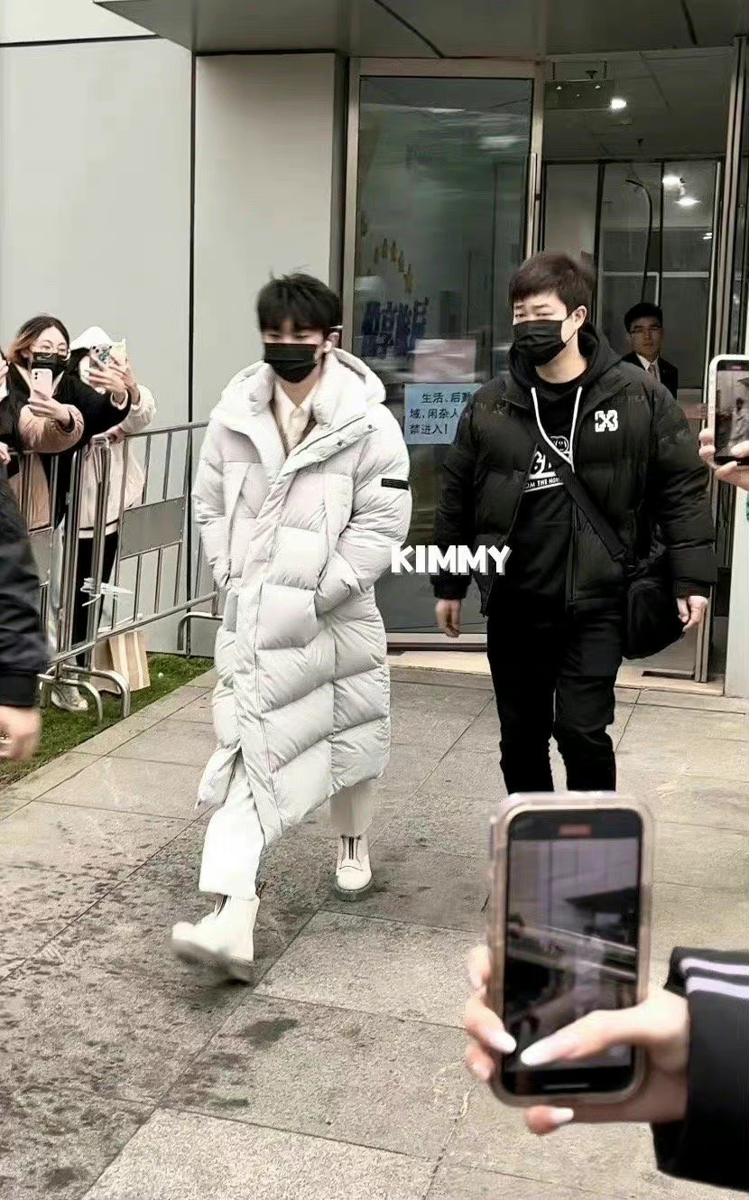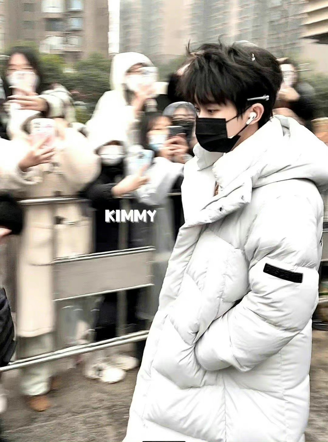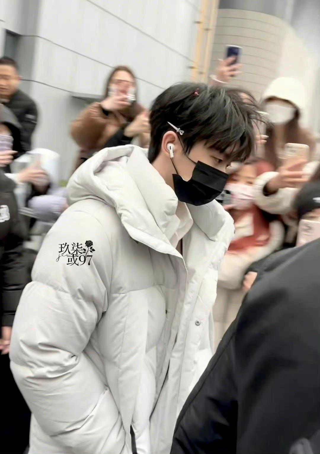 白色长款羽绒服保暖做的很到位,头上还夹着小夹子,好乖哦!录制顺利啊!@时代少年团队长-马嘉祺