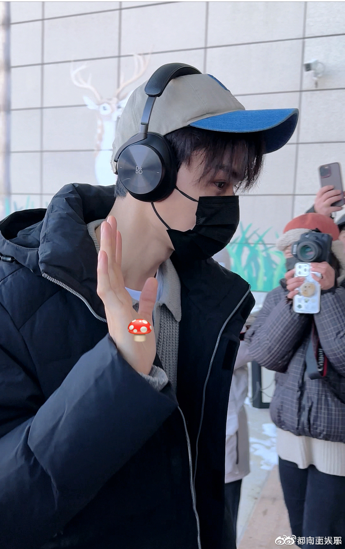 黑色羽绒服+蓝色毛衣造型,俊俊戴着耳机出发啦~