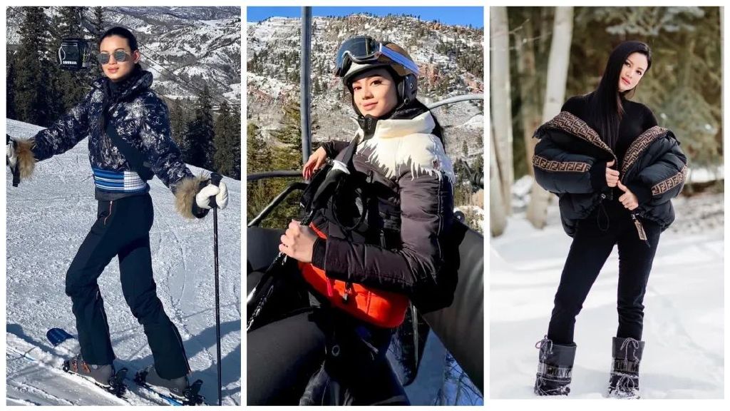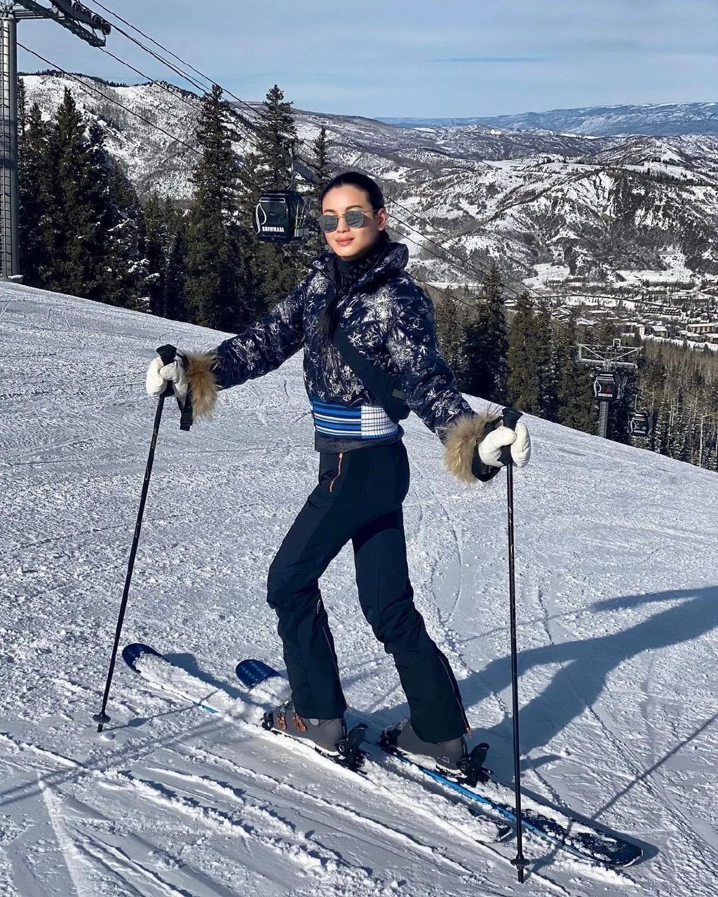 同样在阿斯彭滑雪的林恬儿,连换三套滑雪羽绒服拍大片,品牌依次为Chanel、Moncler、Fendi,画风相当壕气。