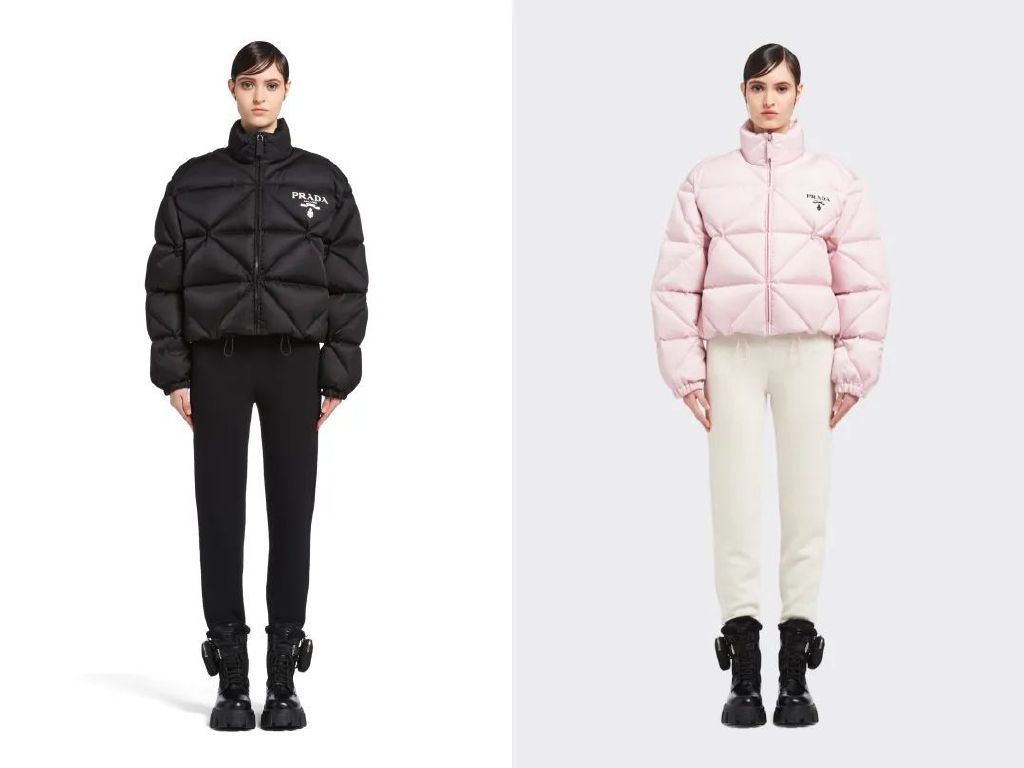 今年短款面包服依然火爆,甚至有越短越流行的趋势。Prada新款羽绒外套采用环保Re-Nylon再生尼龙华达呢打造,廓形宽大又短,有种复古时尚感。三角格纹用3D立体缝线工艺打造,点缀Prada刻字徽标,黑色经典、粉色元气。