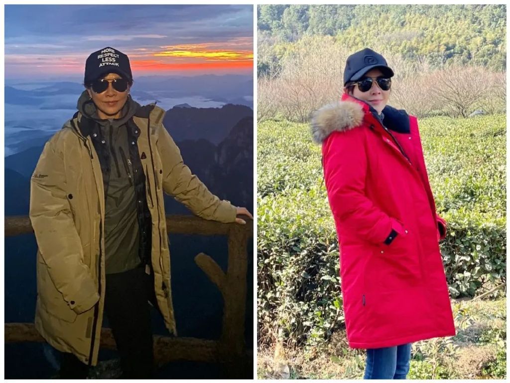 除了高腰、束腰可以视觉上优化比例,拼接设计也是不错的选择。刘嘉玲登黄山这件Sacai拼接款,乍一看还以为是长羽绒外面套了件短大衣,其实是假两件来着,利用冲突式拼接制造层次感,视觉上更显高挑。