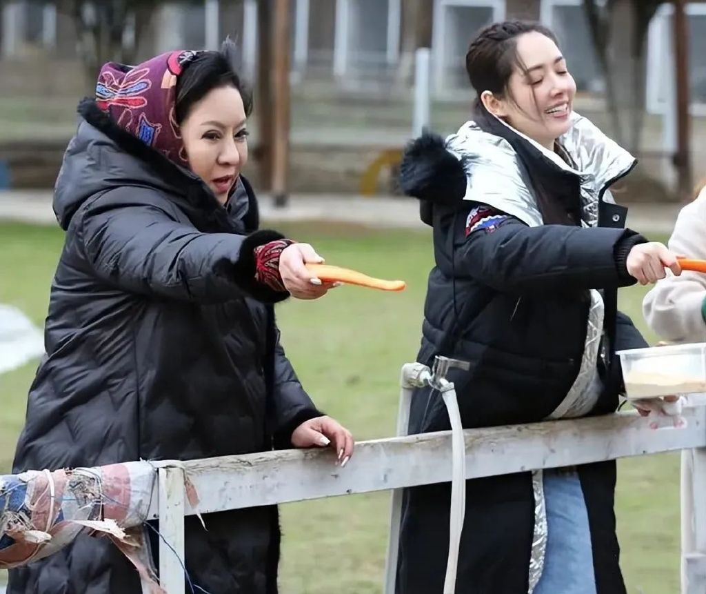 郭晶晶婆婆朱玲玲,和好友叶倩文出游时,也都穿了黑色羽绒服,担心纯黑色乏味的,也可以像她们这样选择光面款或者内搭白色做提亮。