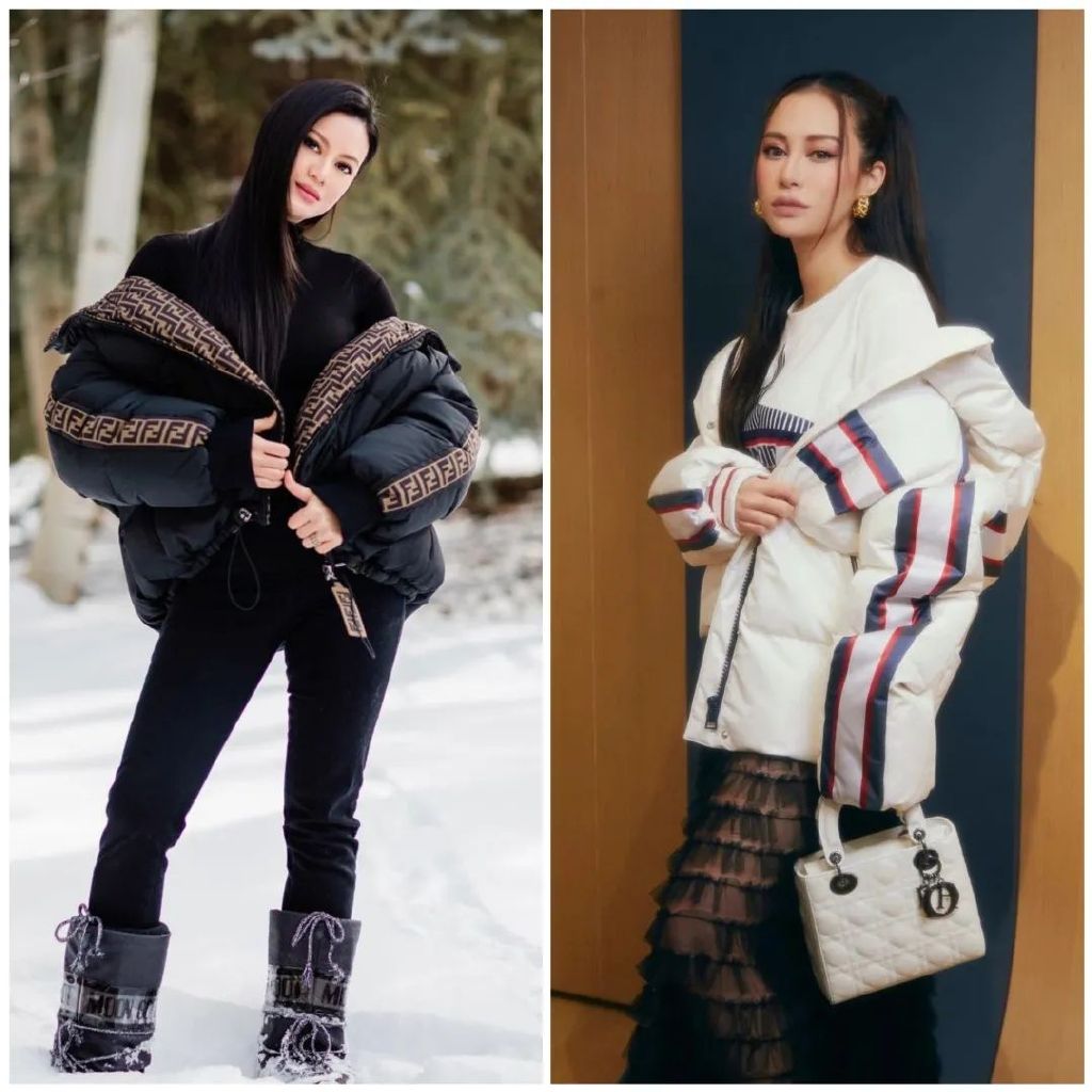 香港名媛姐妹花林恬儿、林心儿,都是印花款羽绒服爱好者,一个穿黑底老花Fendi酷劲十足、一个穿白底条纹Dior配纱裙少女感十足。