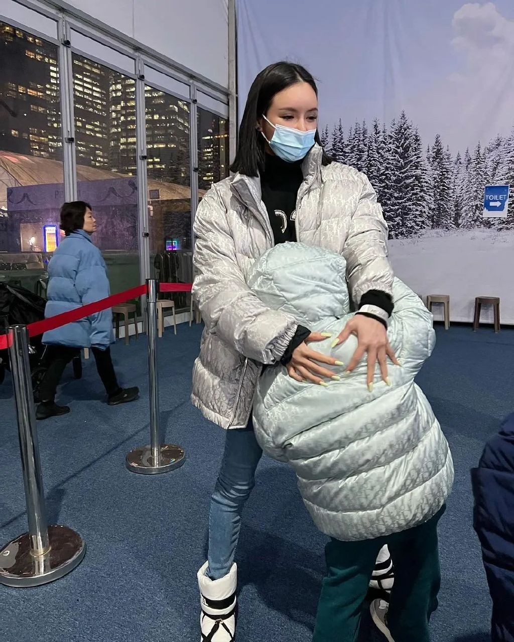 新加坡名媛林慧俐,圣诞节带娃滑雪时穿了亲子款Dior羽绒服,镜面银色加通体字母logo,减龄效果满分。