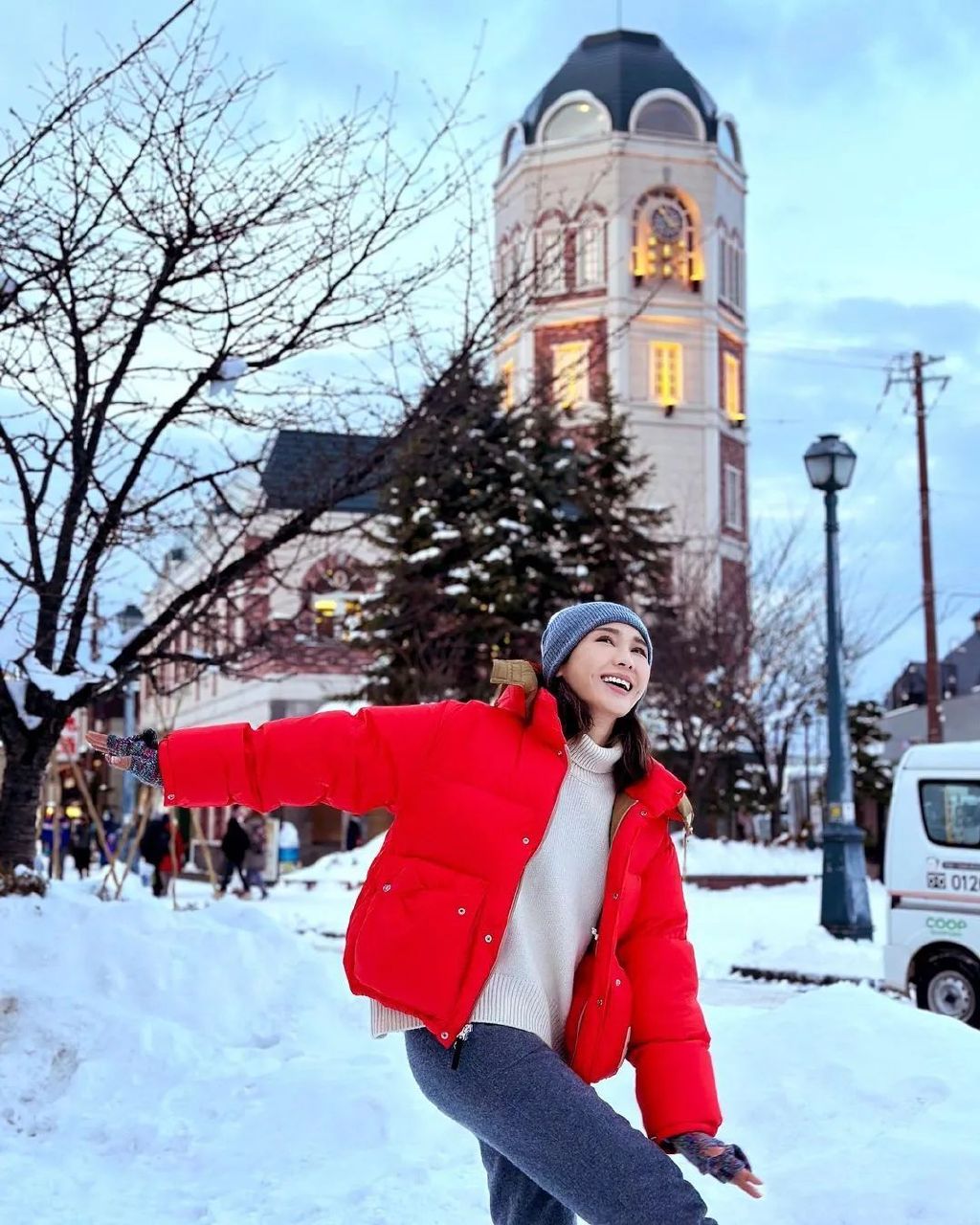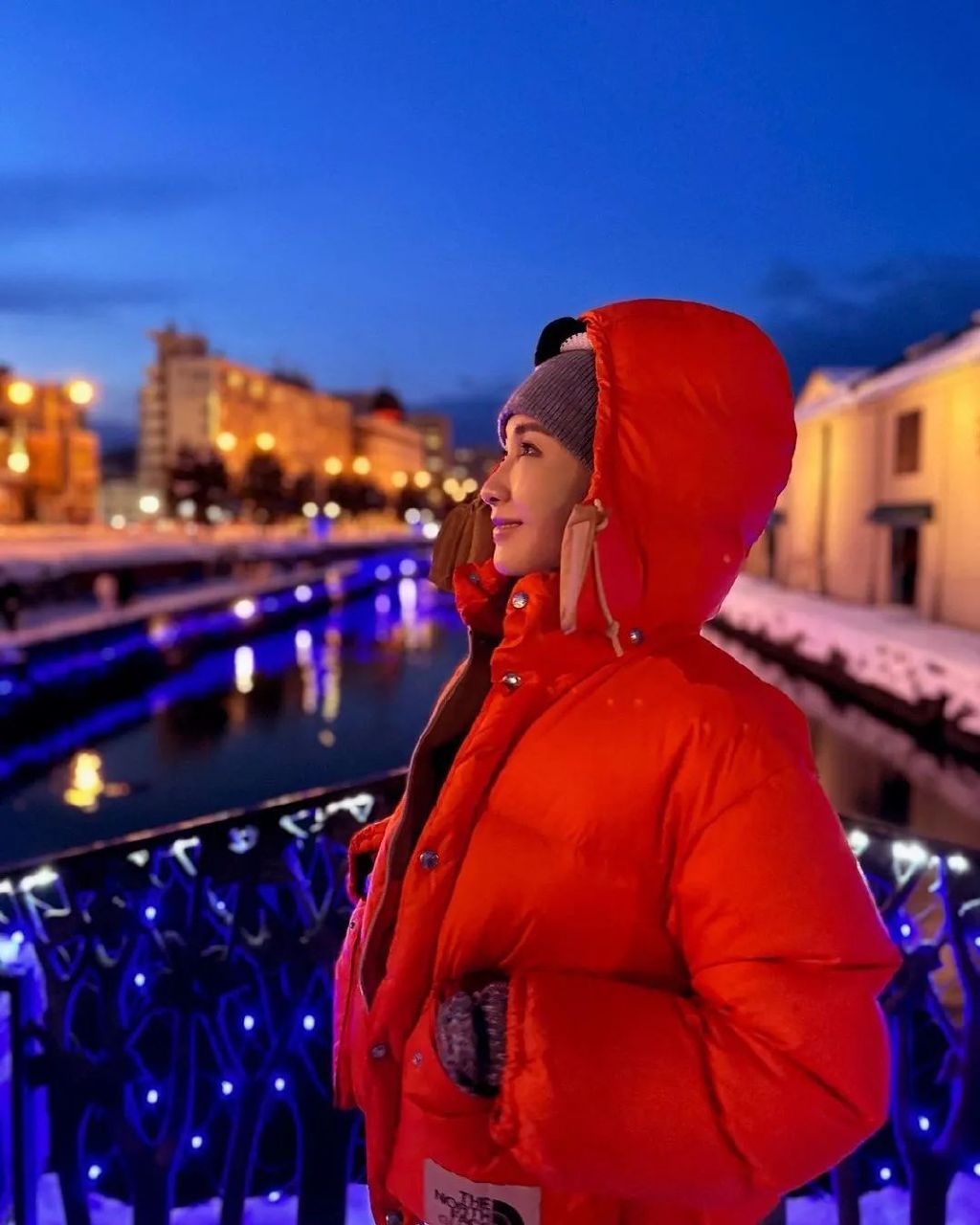 黎姿则去到了北海道,身穿喜庆的红色羽绒服,在雪地上手舞足蹈、笑颜如花↓