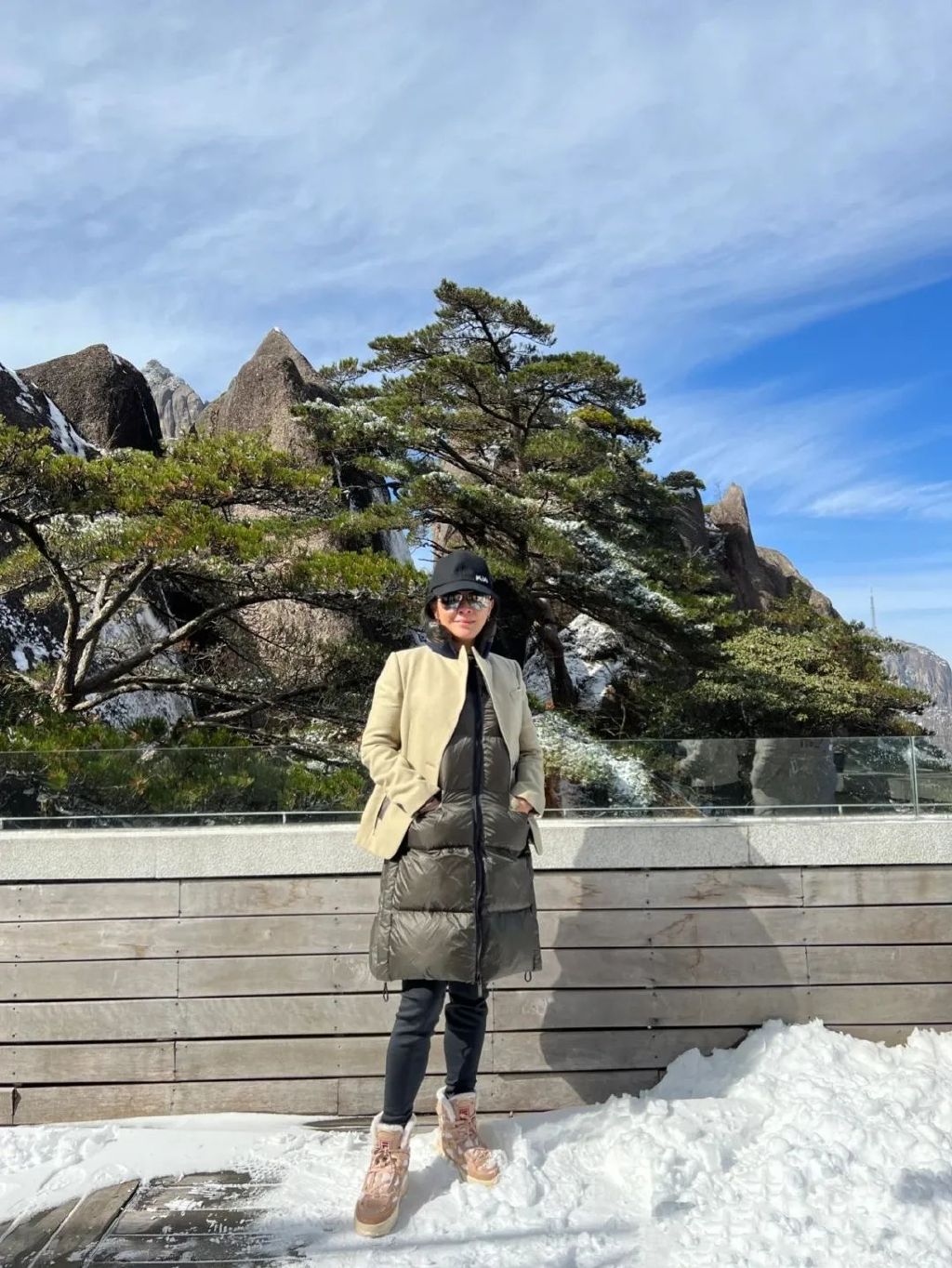 富士康老板娘曾馨莹,晒出的新年赏雪大片,白色长款羽绒服和背景融为一体,奶fufu的颜色,毛茸茸的帽子配起来有点可爱~