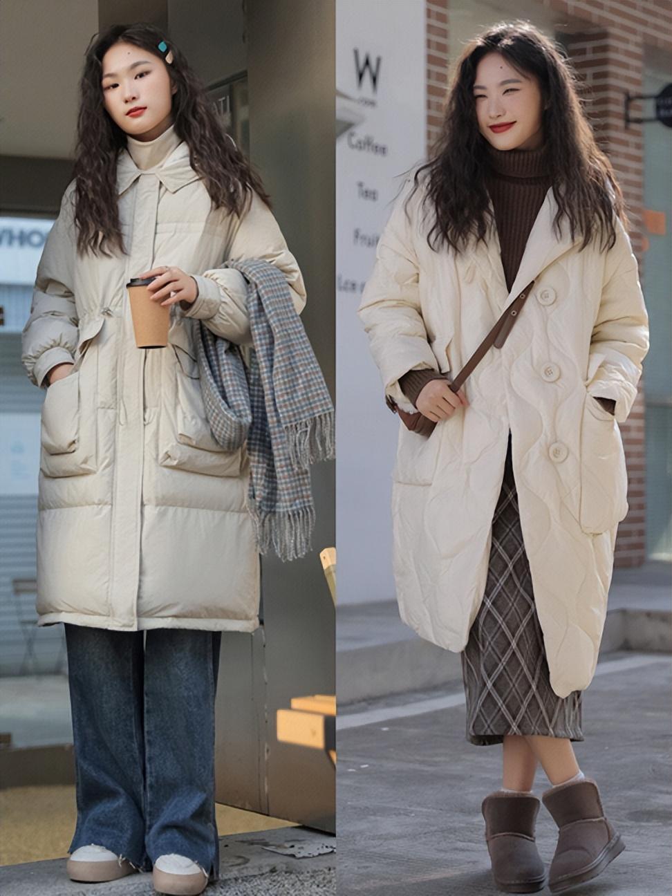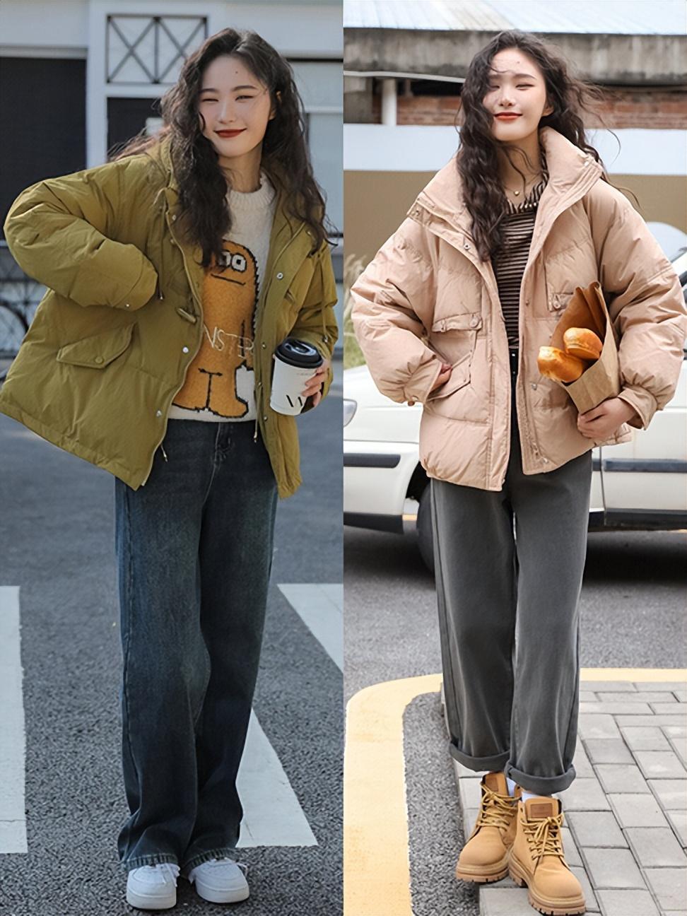 羽绒服款式蓬松,有可能会显胖,姐妹们在搭配的时候可以先试着结合这种简单的直筒裤,这种裤装的剪裁利落,而且非常时髦。