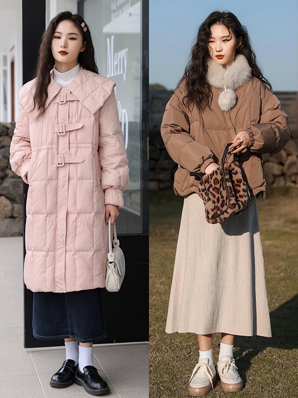 穿羽绒服时下半身搭配的单品不仅只有裤子,还可以选择裙子去混搭,用这些时髦的裙子配上这种高级的羽绒服,也可以让我们的穿搭变得更有温柔的气息,更具有女人味,整个造型的风格才不会显得单调。