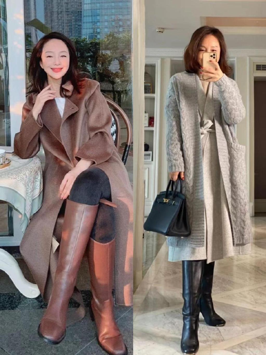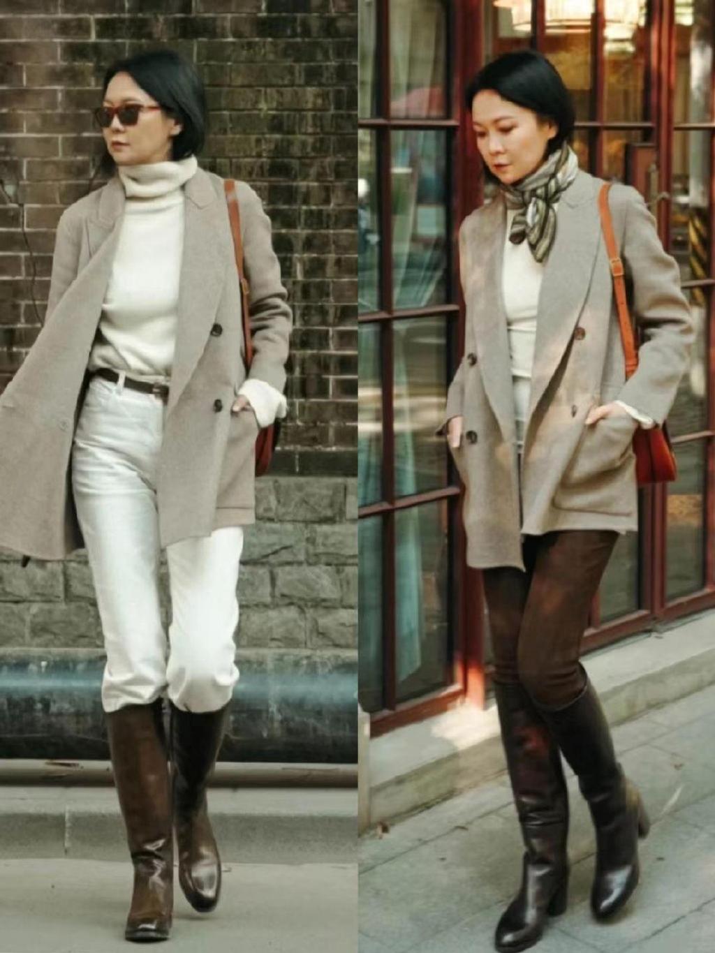 呢子长大衣组合长筒靴,保暖又有风度,对于中年妈妈,你也可以用呢子过腰短大衣匹配长筒靴,不压个子又简洁利落。