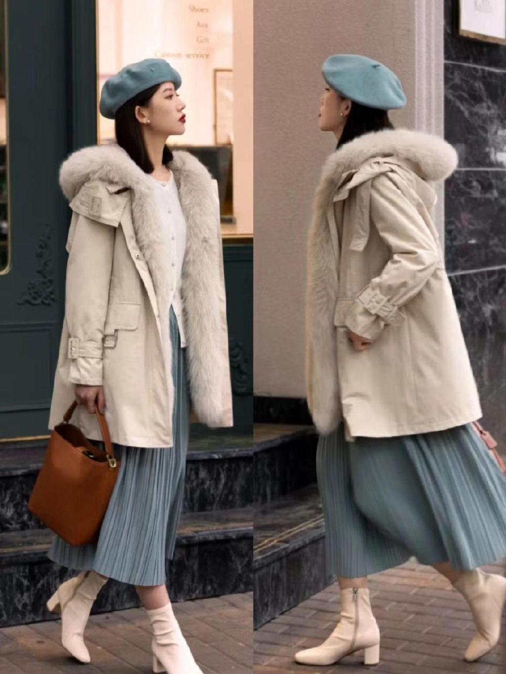 用羽绒服搭配短靴,建议你多选粗跟瘦瘦靴,统一羽绒服与瘦瘦靴的颜色,显高显瘦。看看Pink是小珍,匹配雾霾蓝色百褶长裙,轻熟感满满。