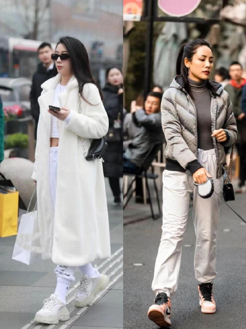 无论是长大衣、短大衣还是短款羽绒服,与球鞋的搭配重点都在于下装。