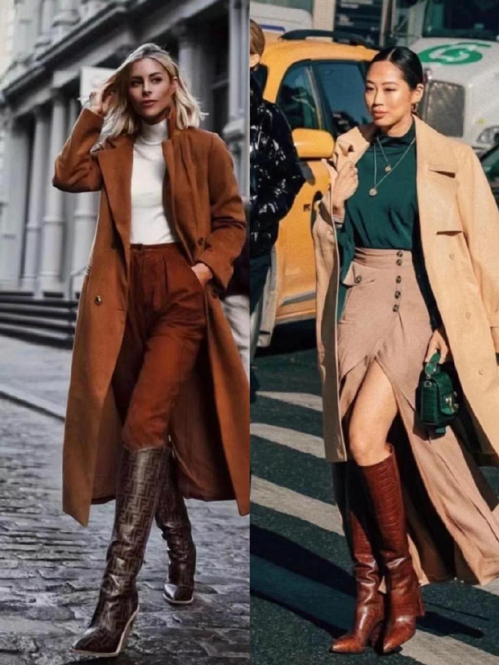 看看很多外国街拍,那些个头高挑的大骨架时髦精们,往往会用大地色系大衣配同色系长筒靴,搭配尖头、高跟设计,引领时尚又摩登大气。