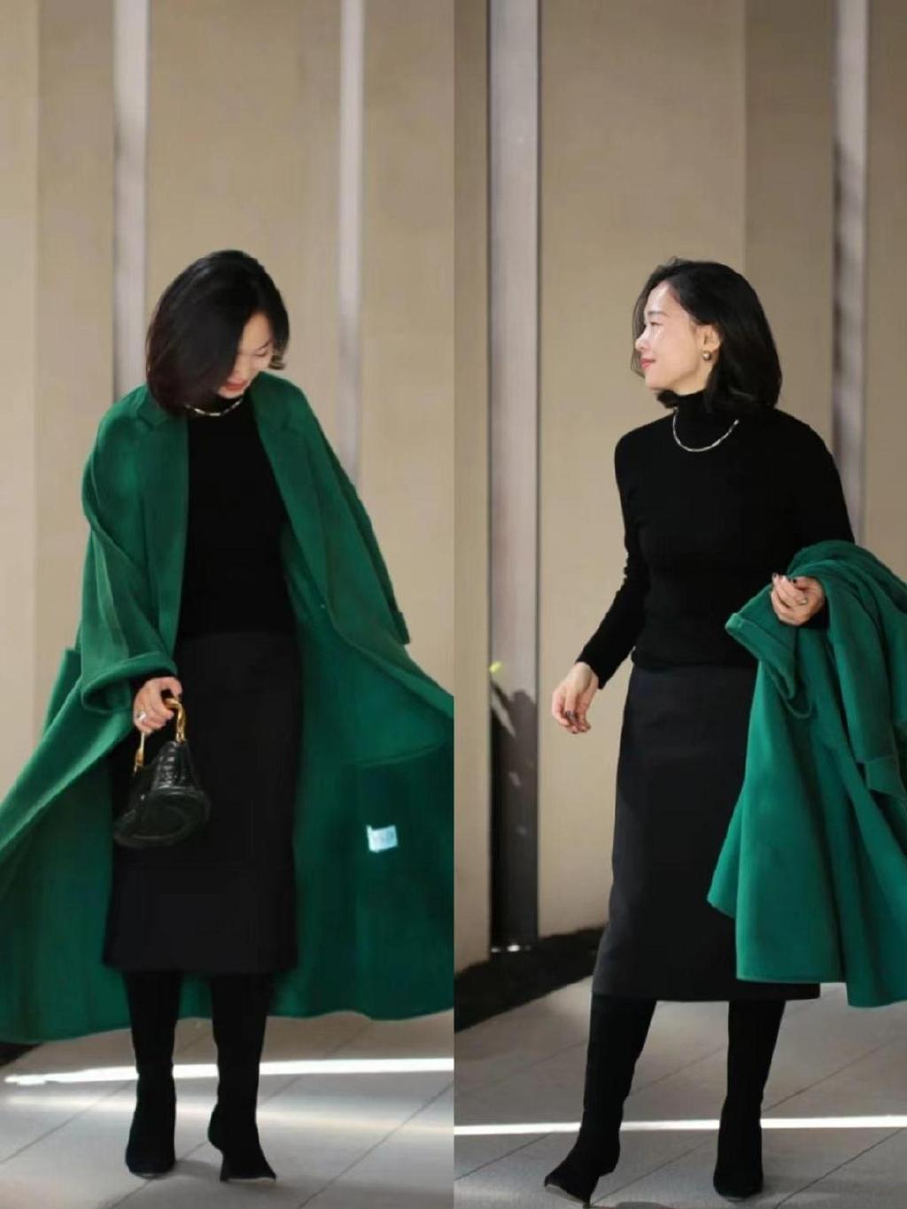 我们可以看看梨形小个子博主Cozy,选取墨绿色大衣打造复古时尚造型时,选择黑色打底衫、膝下裙、长筒靴,视觉上形成窄长H型,优雅体面又显瘦显高。