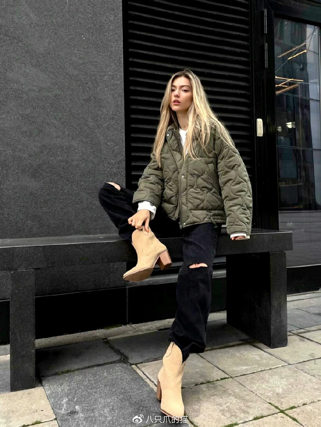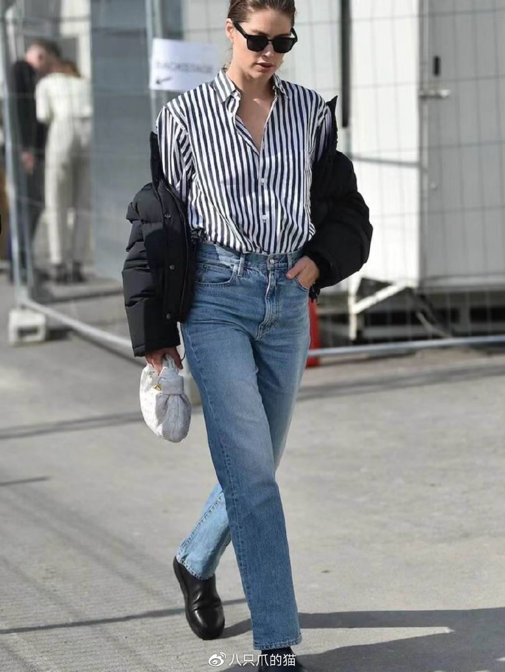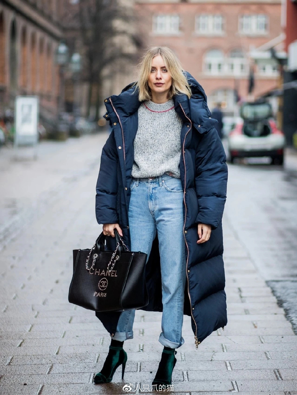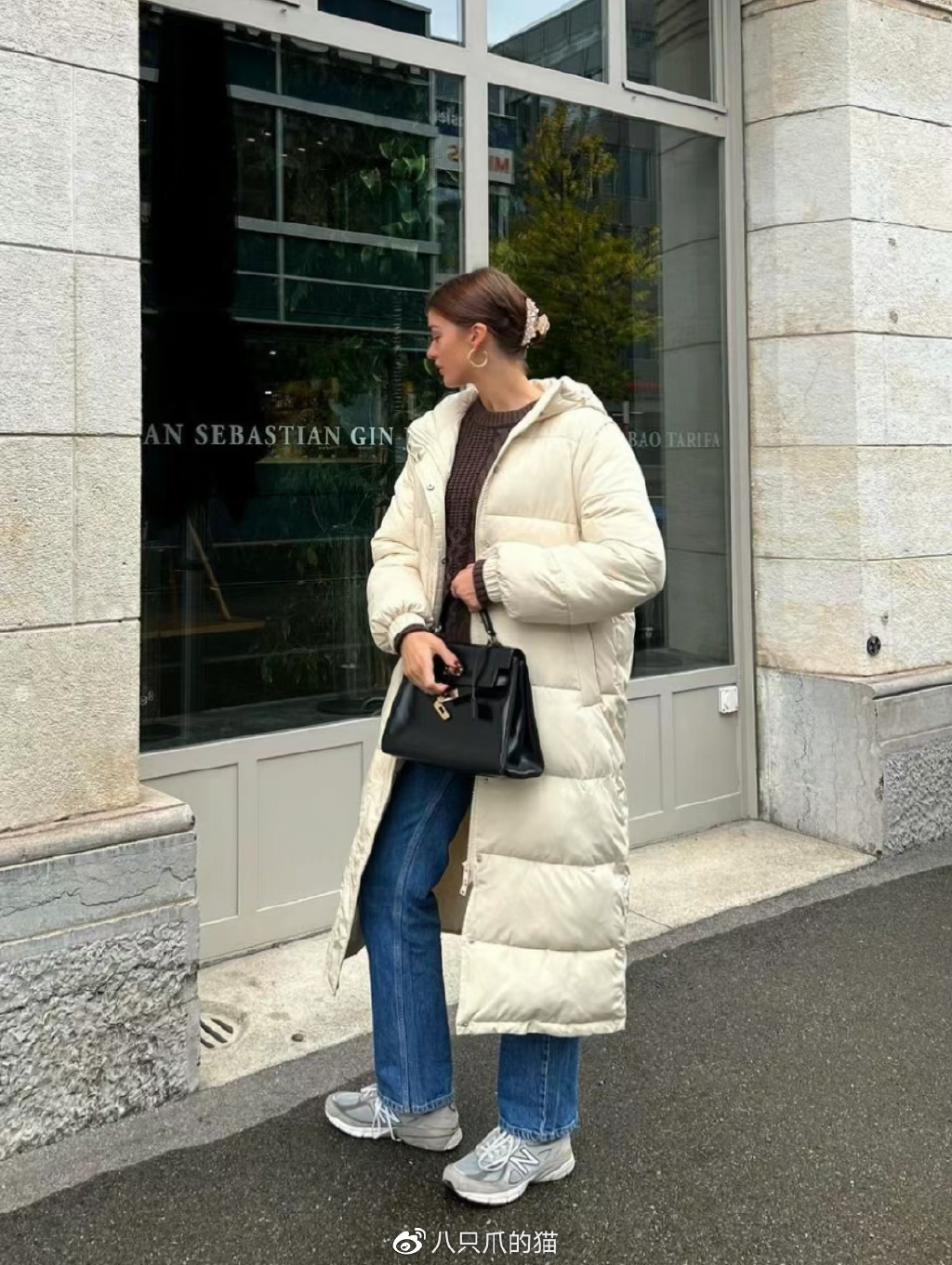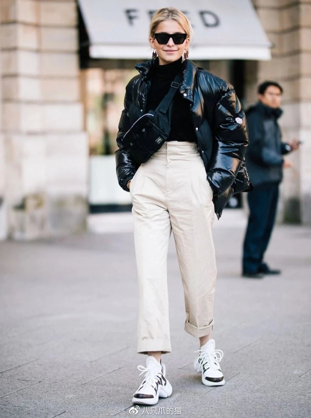 比如上图这套Look:博主选择了一款灰色厚底的老爹鞋来搭配直筒裤和白色羽绒服,稳住了下半身的阵脚,避免了整体比例不协调。而且老爹鞋本身就偏休闲,它的加入为都市洒脱的着装带来了更多的时尚观感,一看就是仔细琢磨过才上身的。