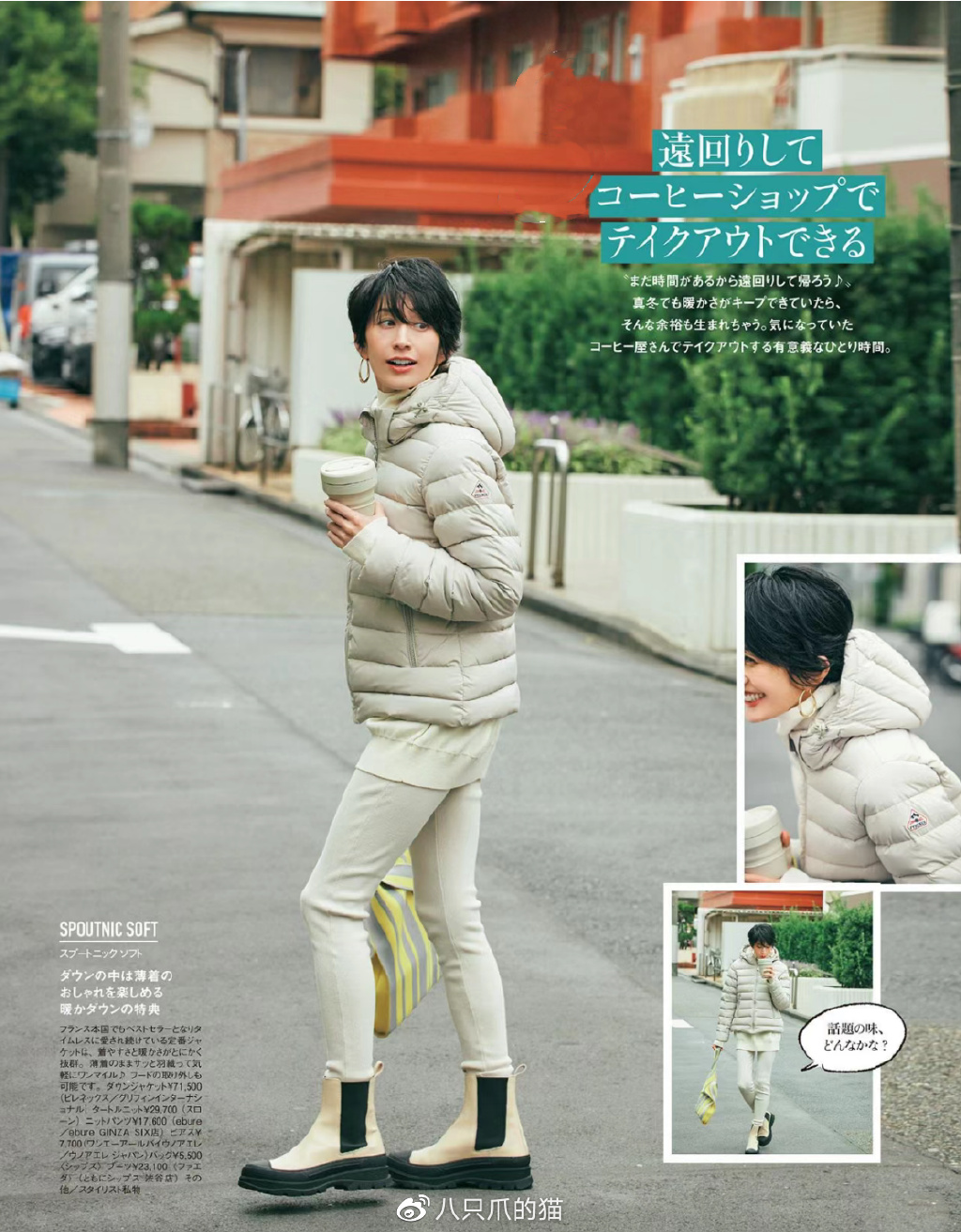 然而羽绒服的体积相当厚重,将它包裹在身上,就只能剩下厚重,还会让人看起来虎背熊腰。所以大多数时髦客在尝试羽绒服时,都会露出里面的内搭和高腰线,给人一种似有非有的轻盈感和高挑感。
