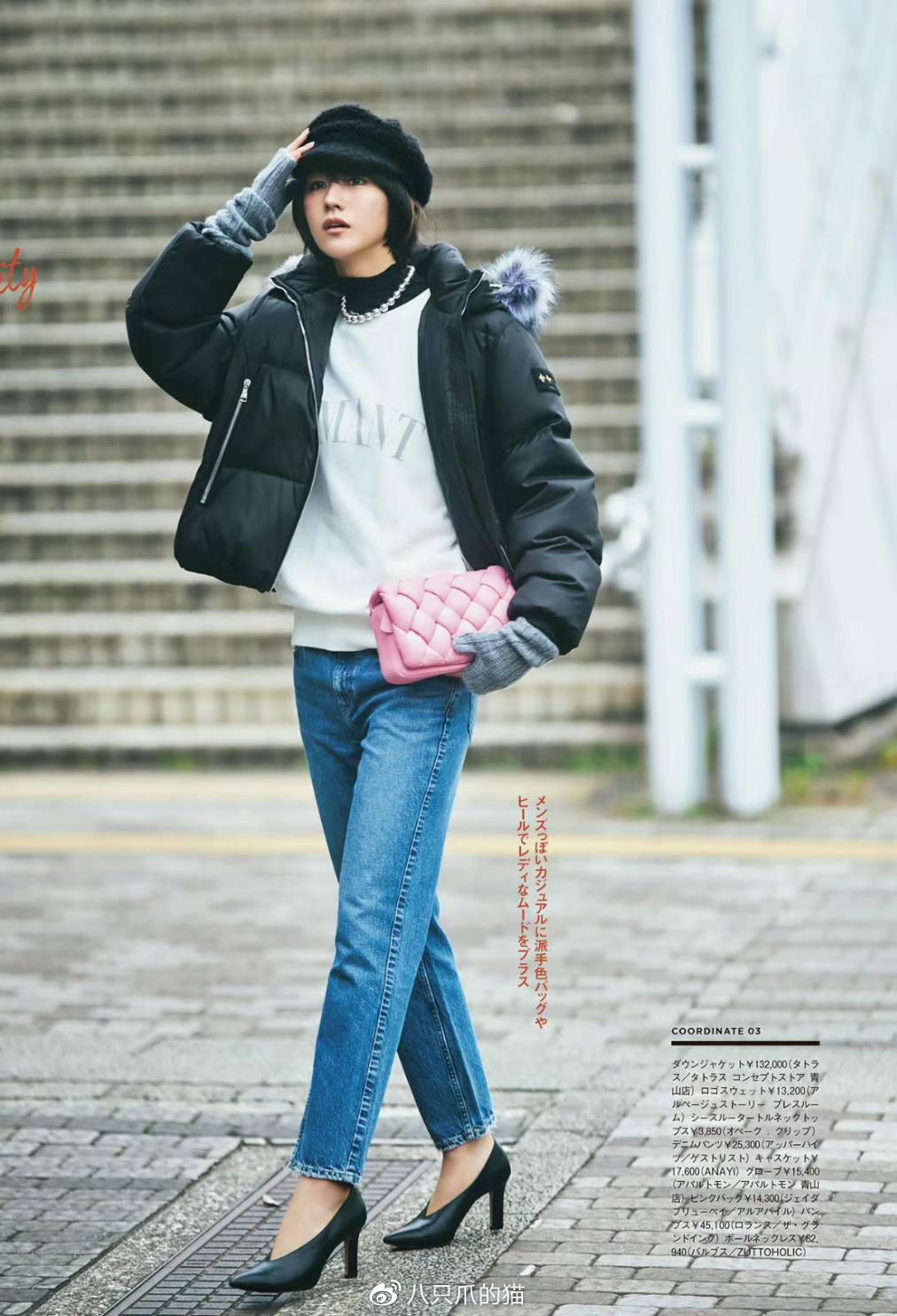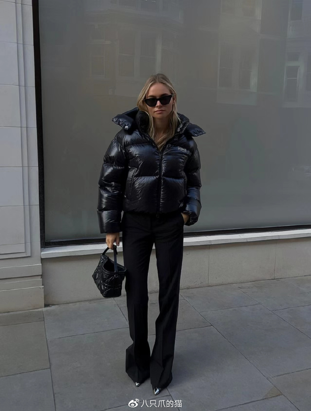 亮点:即使黑色的长款羽绒服量感厚重,但终究也抵不过高腰线和高跟鞋所带来的优雅精致化的氛围。