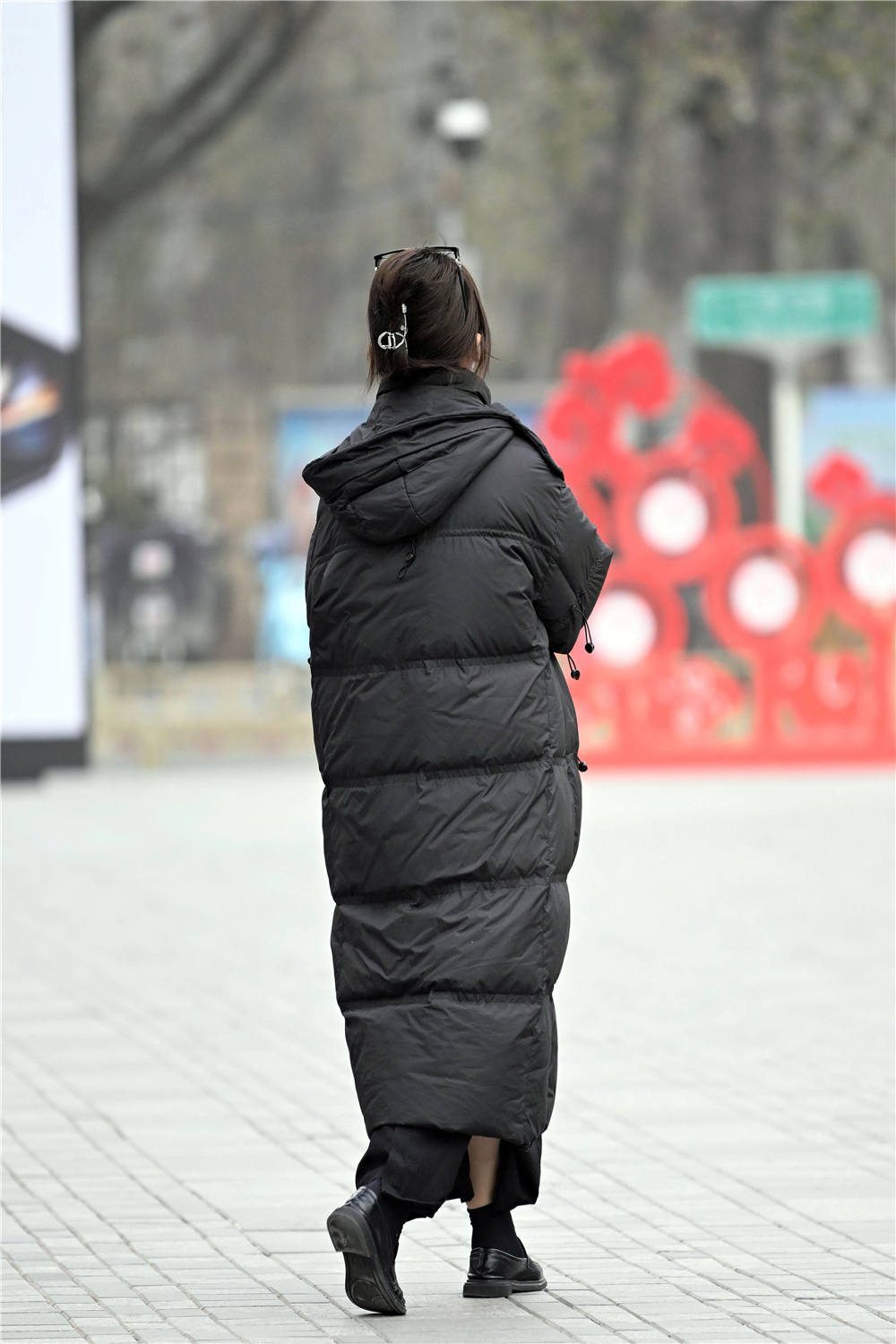 生活中共的搭配,要生活化一些,简单自然,其他人也可以学习借鉴,这位美女选择搭配很简单,一款黑色的长款羽绒服,缝合线形成的横条纹理,非常舒服,也搭配出简约的效果,衣摆到脚踝上面一些的位置,这样整体的搭配就变得更加简单,黑色的皮鞋,单鞋设计,年轻姑娘比较喜欢的款式,穿着不会很累,但是不会衬托身材高挑,搭配黑色的棉袜,也是很舒服的搭配风格。