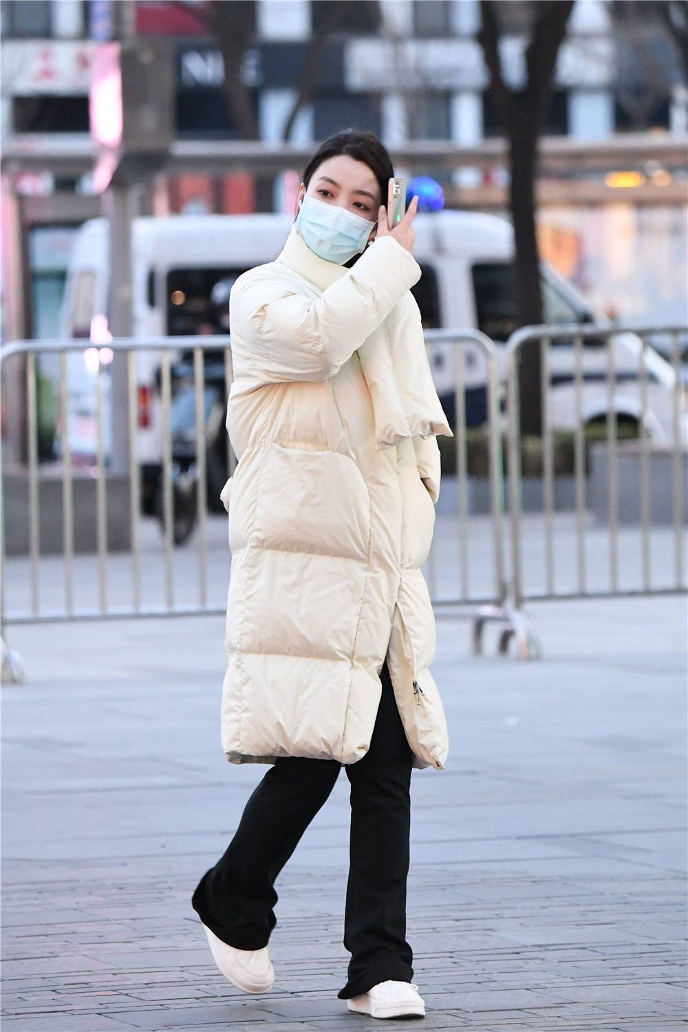 冬季常见的长款羽绒服,也要搭配出自己的风格,款式很颜色,也要注意一些,这位美女选择米白色的长款羽绒服,衣摆到膝盖的位置,也是很舒服的搭配,穿搭要展现出自己的风格,米白的围巾,也是很保暖的搭配效果,黑色的微喇叭长裤,裤腿稍微长一些,很舒服的搭配,搭配白色的板鞋,棉鞋的设计风格,比较保暖一些,也搭配出简约的效果,穿搭就要有点自己的想法。