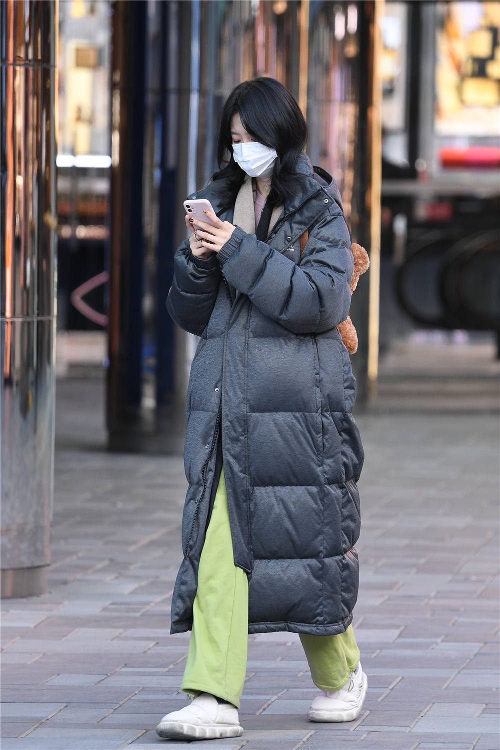 很多人喜欢搭配简单一些,羽绒服搭配,在冬季也是比较流行的,长款羽绒服搭配,很舒服,也搭配出不一样的感觉,这位美女选择深灰色的长款羽绒服,衣摆过膝长度,到小腿的位置,宽松的款式,拉链没有拉起来,显得很大气,也看出天气没有那么冷,绿色的直筒长裤,搭配灰色的平底鞋,有着棉鞋的风格,很舒服的搭配,也搭配出不一样的感觉,灰色围巾,还背着小熊,是不是很特别的搭配呢?