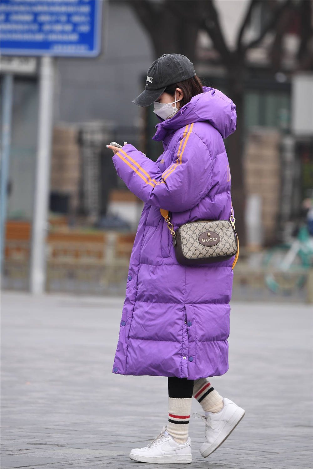 穿搭也要有点自己的风格,也要搭配出自己的效果,这位美女搭配蓝紫色的羽绒服,色彩非常特别,也搭配出不一样的感觉,衣摆过膝长度,穿出很舒服的效果,扣子和拉链都没有系上,看起来比较宽松的设计,羽绒服自带的帽子,没有带上,有黑色的鸭舌帽,起到了很好的点缀效果,搭配黑色的紧身裤,米白色的棉袜,一圈黑色和红色点缀,怎就该层次感,白色板鞋,也是很休闲的搭配,斜背着灰色的单肩包,也是很休闲的搭配。