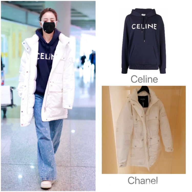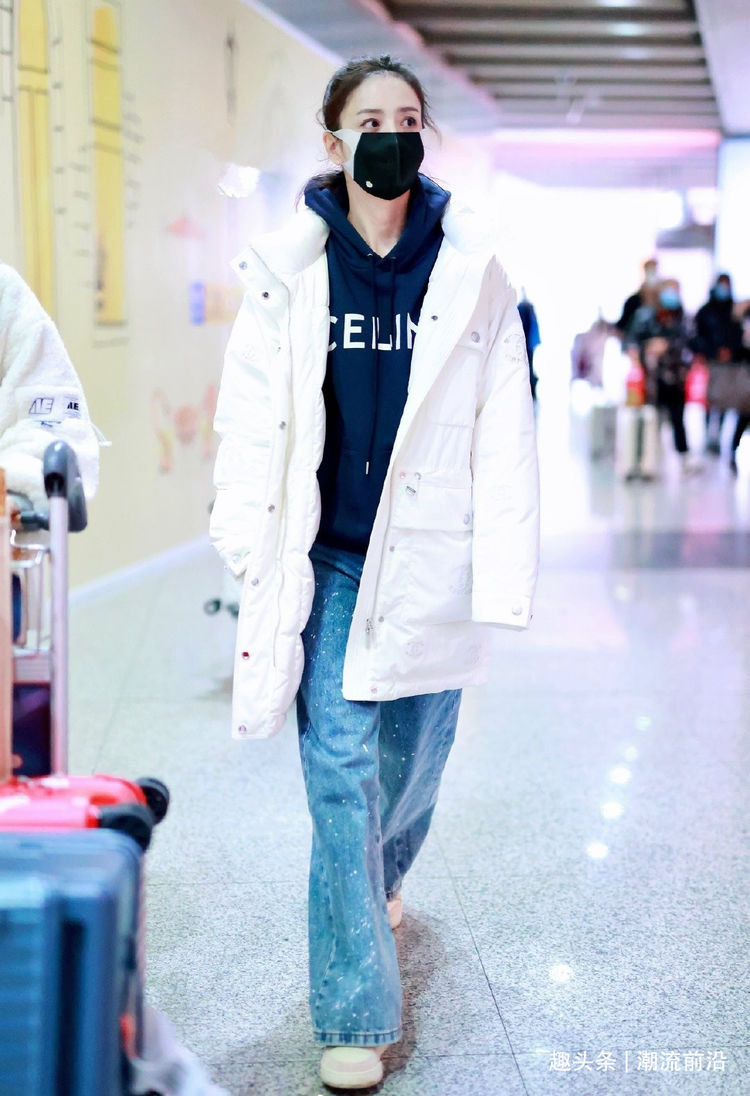 佟丽娅身上这件羽绒服的长度在膝盖以上,视觉上减短了腿长。臀部以下的长度又遮住了腰线,所以具有显矮显胖的缺点,因此在搭配时,佟丽娅选择了短款的卫衣作为内搭,把握“外长内短”的搭配技巧,利用短款的内搭来提高腰线,优化身材比例,从正面看的话,既有腰线又能在视觉上“拉腿”,避免显矮显胖的尴尬。