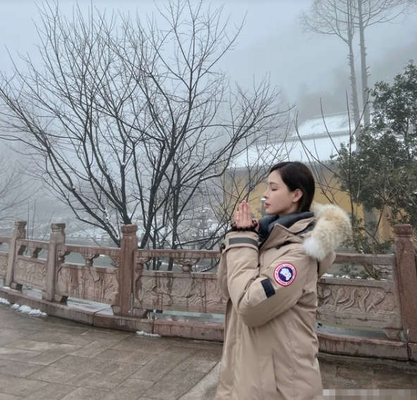从张颖颖的着装能够看出,时下的九华山仍然是严寒时节,她内穿一件黑色羽绒服,外套一件棕黄色某知名品牌羽绒服,这样的穿着乍一看没什么问题,但细琢磨却显得异常,同时穿两件羽绒服的搭配并不合常理,何况是张颖颖这样注重形象的人。