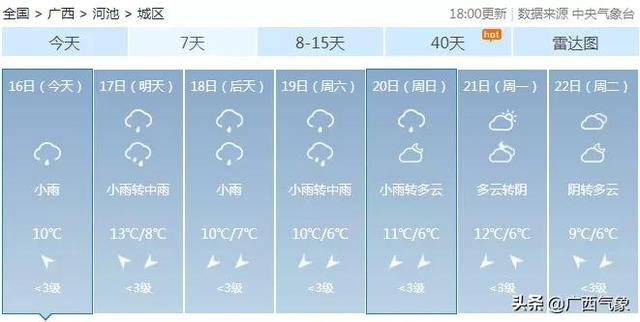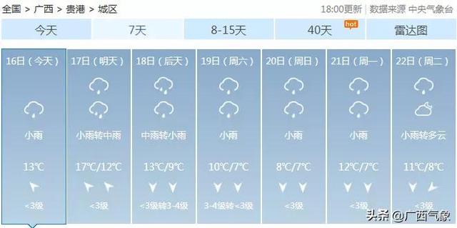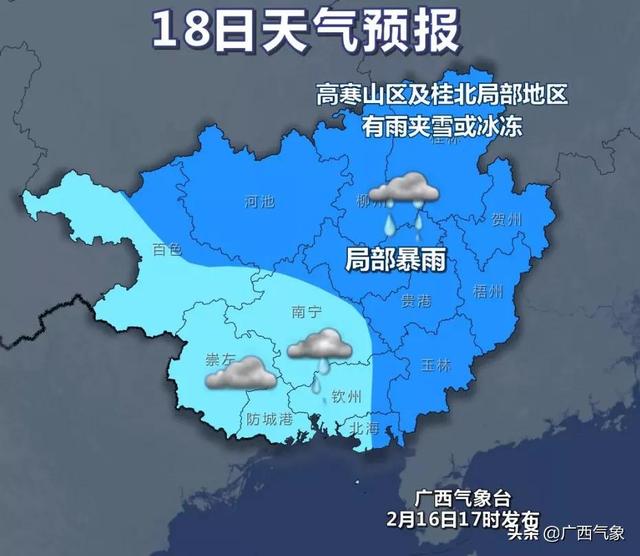 18日,桂北、桂东大部有中雨,局部暴雨,我区其它地区阴天有小雨。高寒山区及桂北局部地区有雨夹雪或冰冻。北海、钦州、防城港、南宁、崇左、贵港、玉林、梧州等市的部分地区有能见度不足1000米的雾或轻到中度回南潮湿天气。各地最低气温:高寒山区零下3~2℃,桂北3~9℃,桂南9~11℃。