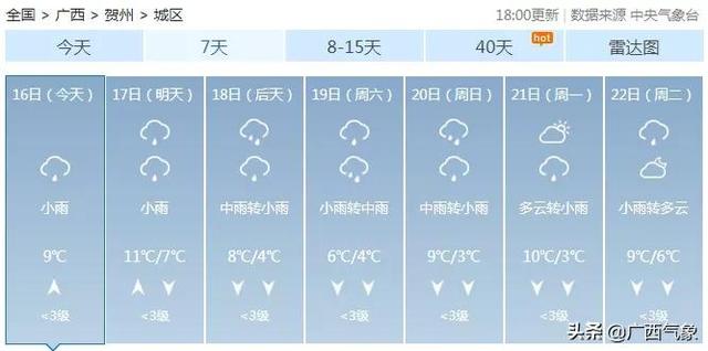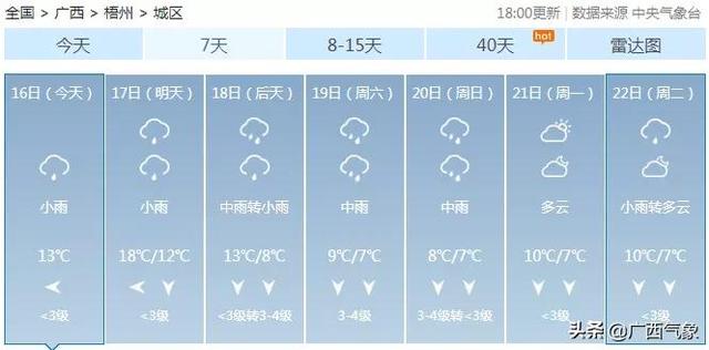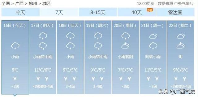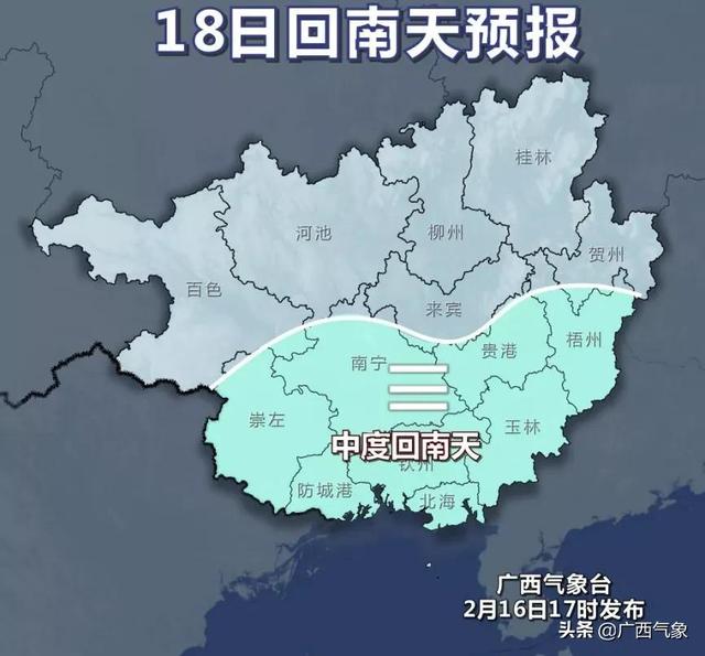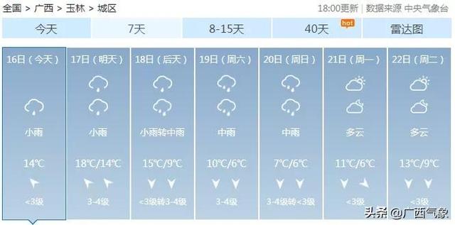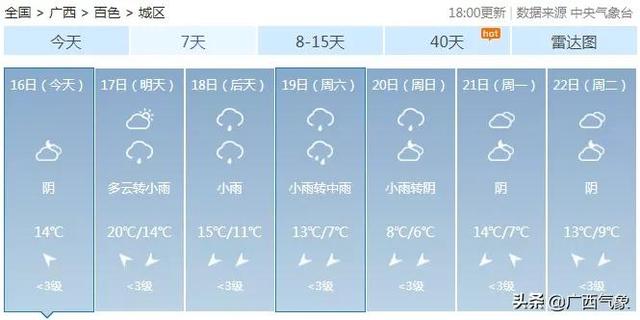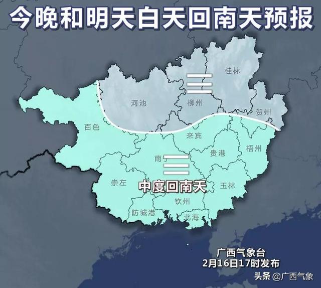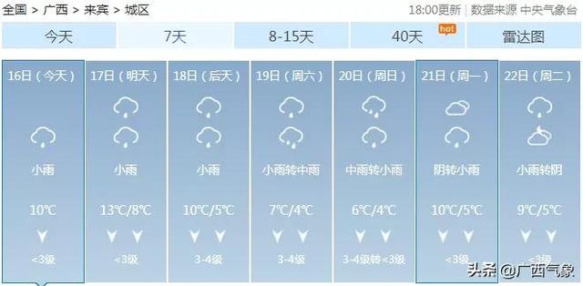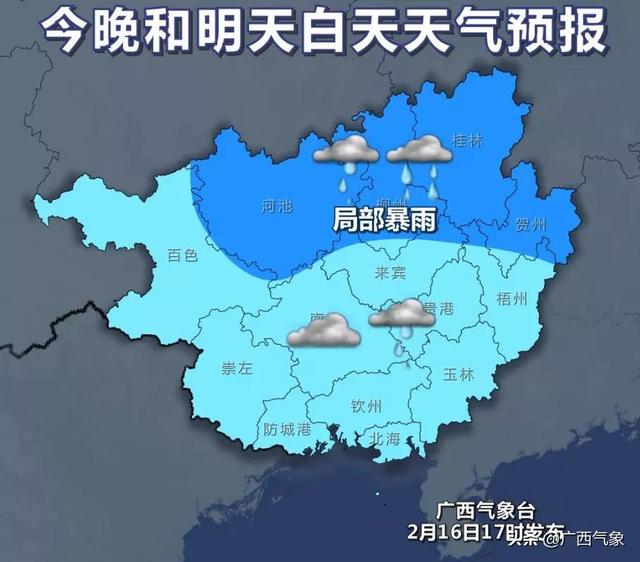 今天晚上和明天白天,全区阴天有小雨,其中桂林、柳州、河池、贺州等市的部分地区有中雨,局部暴雨。全区大部有能见度不足1000米的雾、回南潮湿天气,其中北海、钦州、防城港、南宁、崇左、贵港、玉林、梧州、来宾、百色等市的部分地区有中度回南潮湿天气。各地最低气温:高寒山区2~6℃,桂北6~14℃,桂南14~16℃。