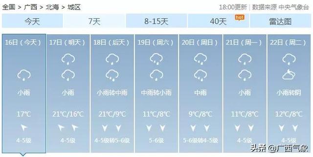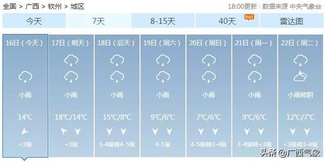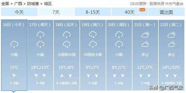 18-20日,受冷空气影响,各地气温下降8~10℃,局部12℃以上。冷空气过境时,桂东北和沿海地区有5~6级,阵风7~8级的偏北风。