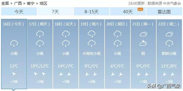 南宁市:今天晚上到明天白天,阴天有小雨,有雾和回南天气,东南风1~2级,最低气温13℃,最高气温19℃。