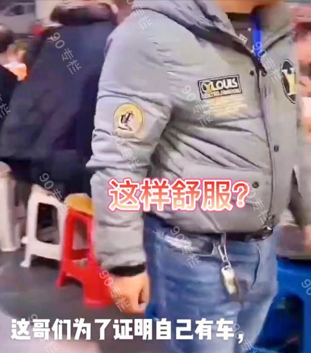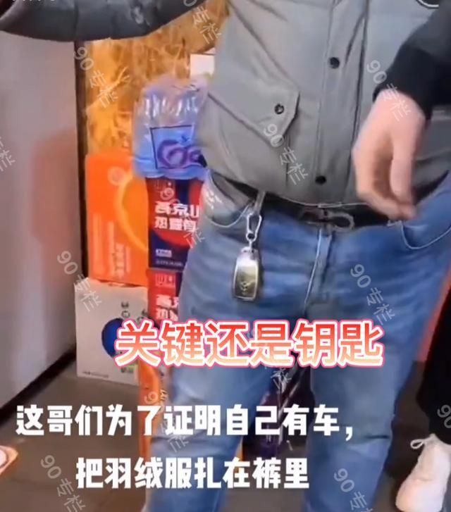 为了露出这个奔驰车钥匙,大哥也着实费了一番心思。大冬天别人穿羽绒服是正常穿着,而他则是把羽绒服塞进了牛仔裤内。
