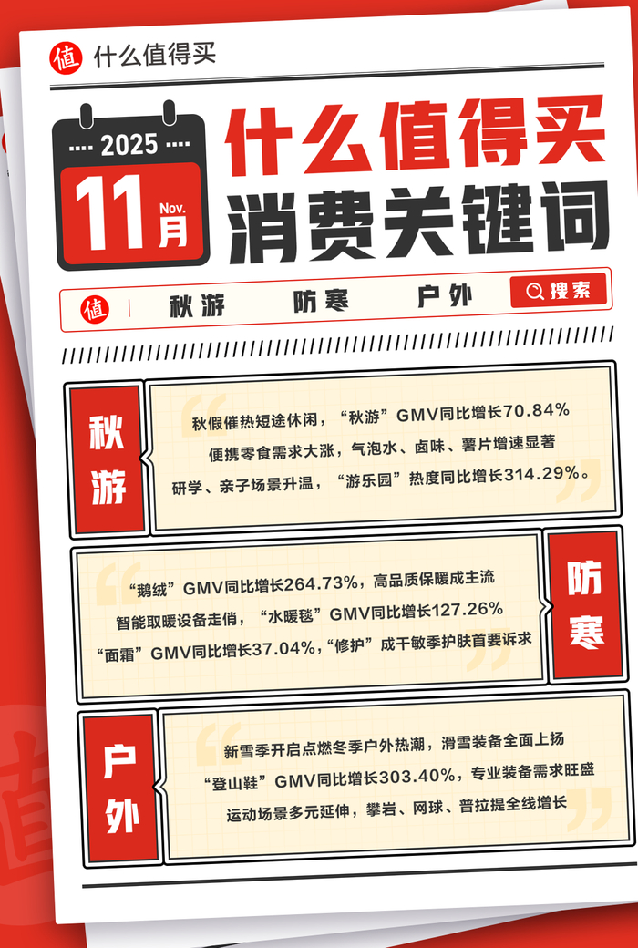 11月28日,“什么值得买”发布11月消费关键词:秋游、防寒、户外。