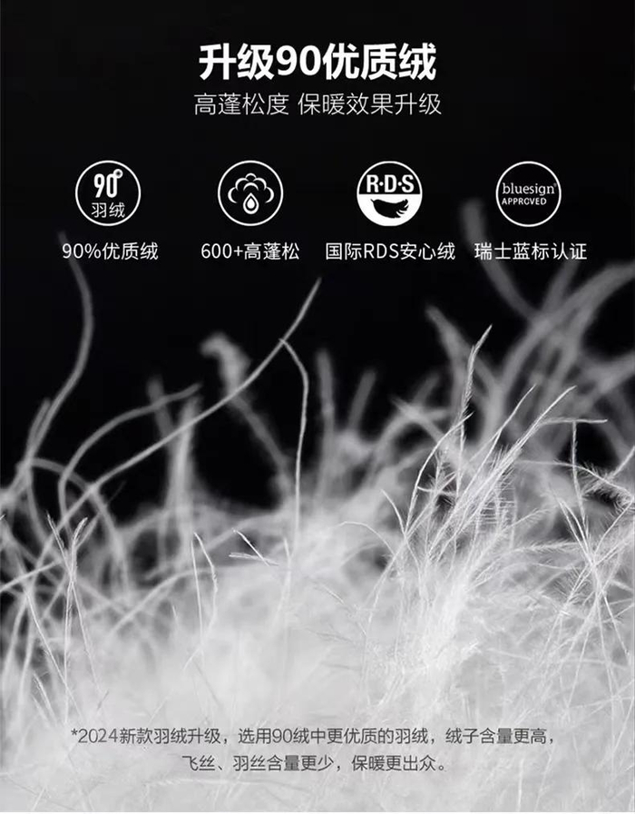而且90%的高含量,远超行业基础标准(国标要求绒子含量≥50%即为合格羽绒服),带来卓越的升温锁温效果。