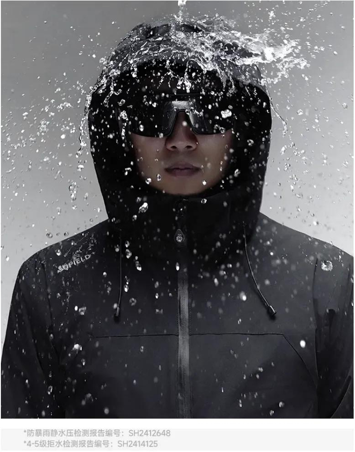 素湃星壳抗寒服面料经过拒水4-5级处理,高透膜复合技术的防水面料,防水指数9000mm/H20