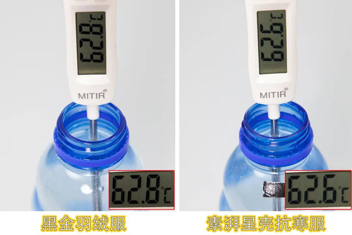 黑金羽绒服和素湃抗寒服分别包裹两瓶62°C的瓶装热水,放在-25°C冰箱