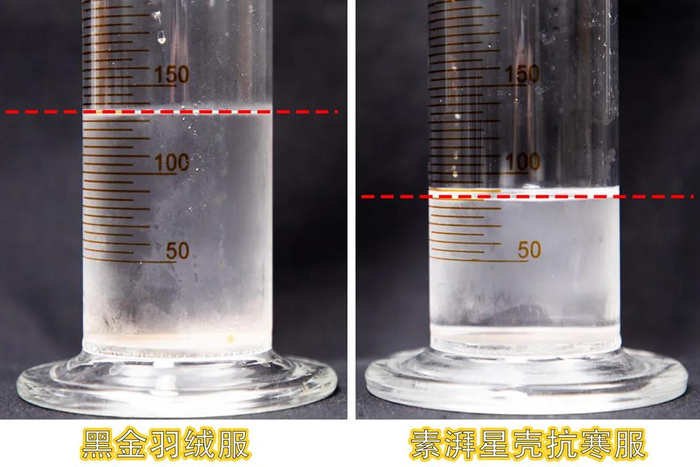 对比黑金羽绒服,两件衣服分别包裹冰块,120分钟后,观察冰块融化成水的程度